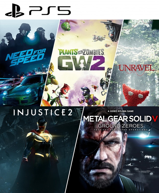 5 JUEGOS EN 1 Injustice 2 mas Metal Gear Solid V ground Zeroes mas Need for Speed mas Plants of Zombies GW2 mas Unravel PS5
